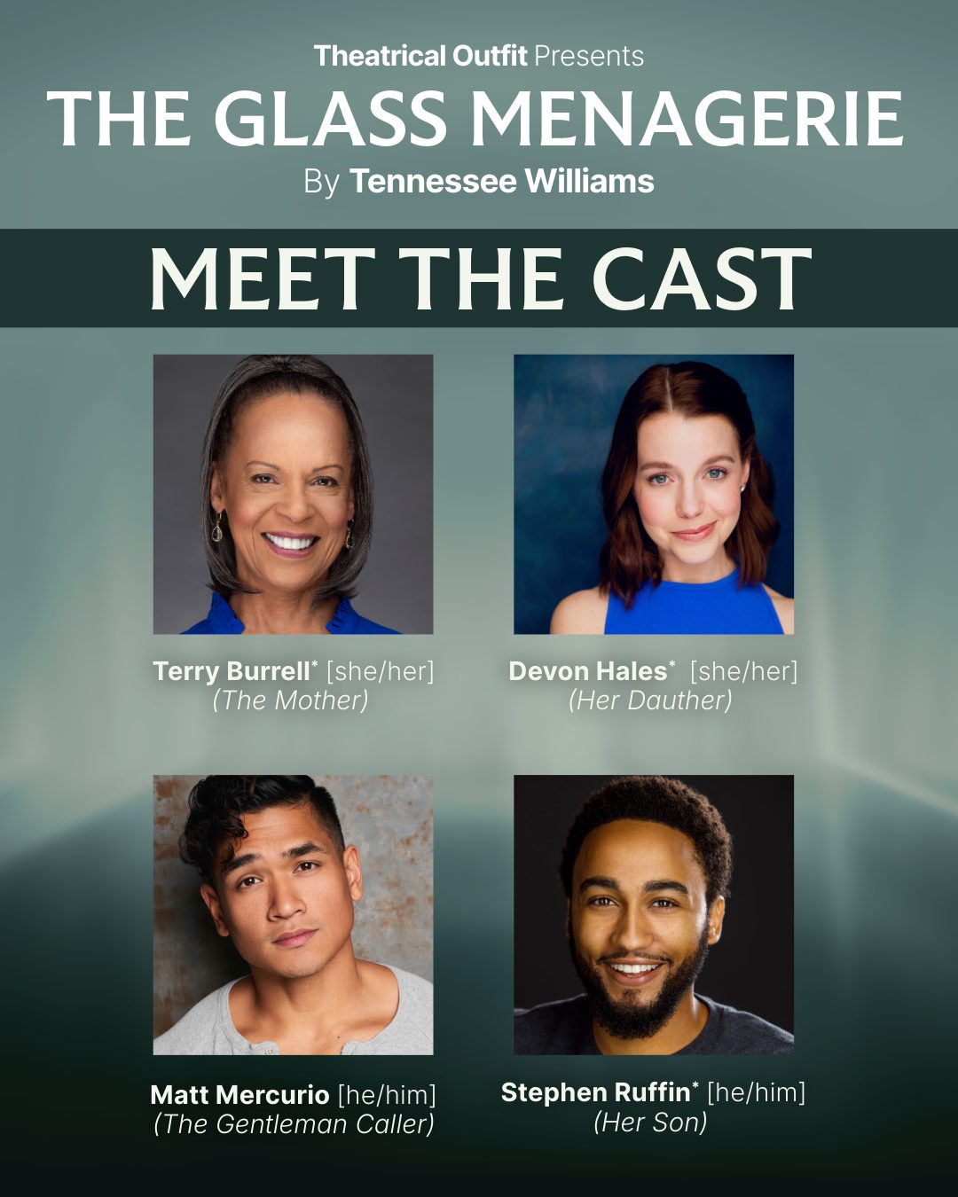 Atlanta-based actor Terry Burrell will lead the cast as Amanda Wingfield, joined by Devon Hales as Laura, Stephen Ruffin as Tom, and Matt Mercurio as Jim. The production is directed by Matt Torney, with dramaturgy by Addae Moon.